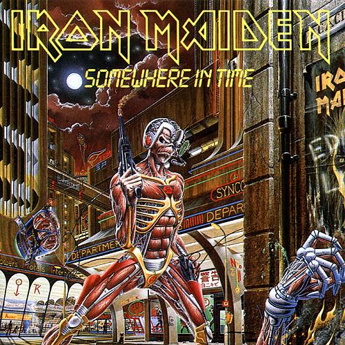 SOMEWHERE IN TIME is the sixth studio album by British heavy metal band Iron Maiden, released on 29 September 1986 on EMI in Europe and its sister label Capitol Records in the U.S. The studio follow-up to the hugely successful Powerslave/Live After Death pair, it was the first Iron Maiden album to feature guitar synthesizers. Bruce Dickinson's song material was refused in favour of the songs of guitarist Adrian Smith, who wrote the bulk of the songs identified with the album (including the singles "Wasted Years" and "Stranger in a Strange Land").